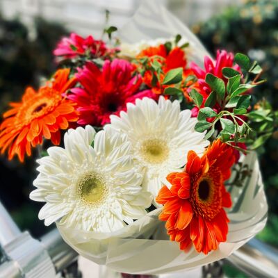 - Gerbera’s: vrolijke blikvangers die best een ritje aankunnen, zeker met steun rondom de stelen.