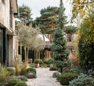 - Cupressocyparis leylandii ‘Gold Rider‘: snelgroeiende, rechte conifeer met gouden tinten die een moderne uitstraling geeft.