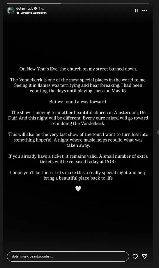 Op vrijdag 15 mei 2026 staat de Amsterdamse muziekwereld in het teken van hoop en solidariteit. Singer-songwriter Dotan organiseert die avond een bijzonder benefietconcert, volledig in het teken van de wederopbouw van de Vondelkerk. Dit monumentale kerkgebouw, jarenlang een geliefde concertlocatie aan de rand van het Vondelpark, werd tijdens de jaarwisseling van 2025 grotendeels verwoest door een felle brand. De schade is enorm en het herstel zal jaren duren.