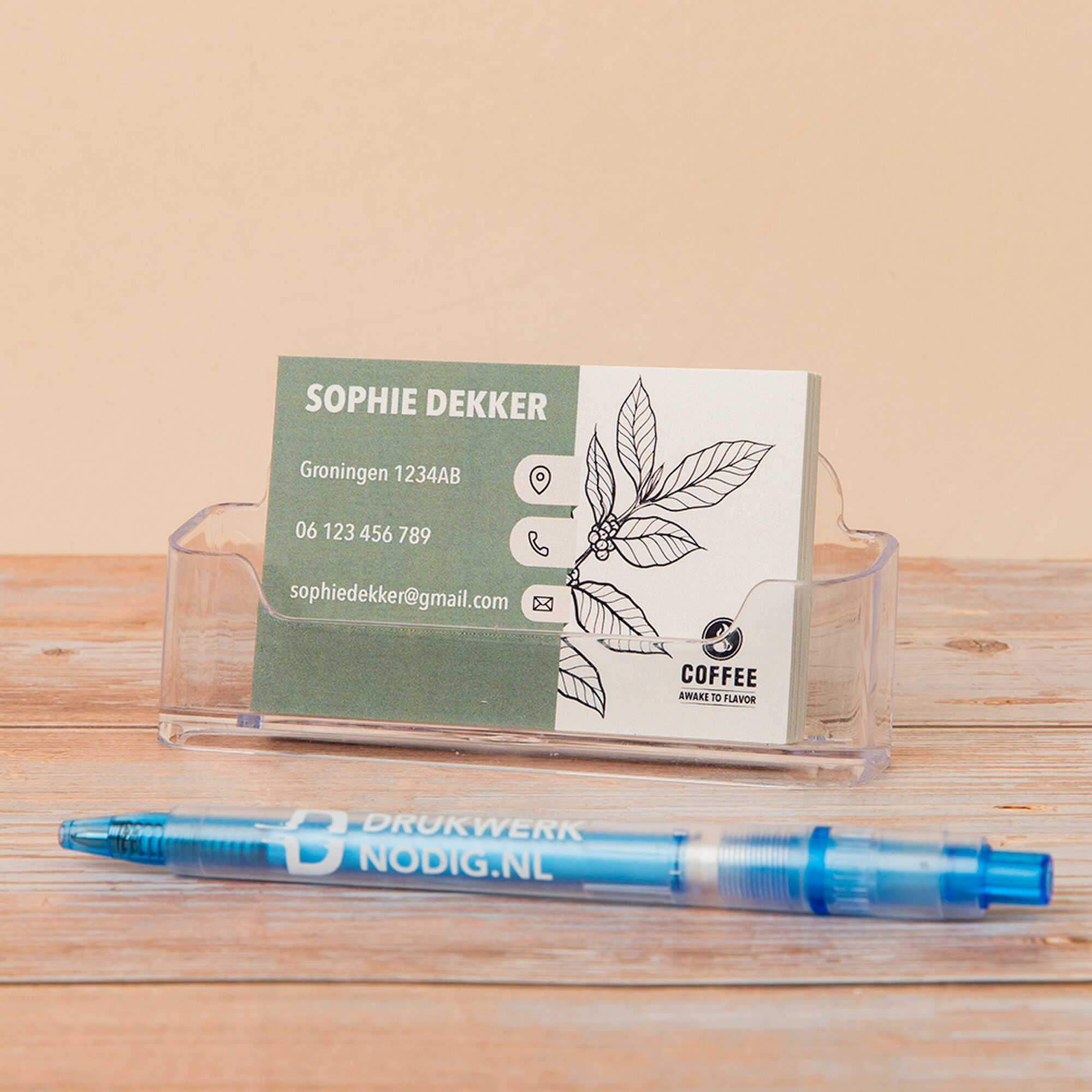Laat visitekaartjes maken met een matte afwerking voor een strakke en professionele uitstraling, glanslaminaat als je opvalt met kleur en contrast, of kies voor soft-touch voor een fluweelzacht gevoel dat luxe uitstraalt. Wil je een duurzamere keuze maken? Dan is er ook te kiezen voor gerecycled papier, dat bijdraagt aan een professionele én milieubewuste uitstraling.