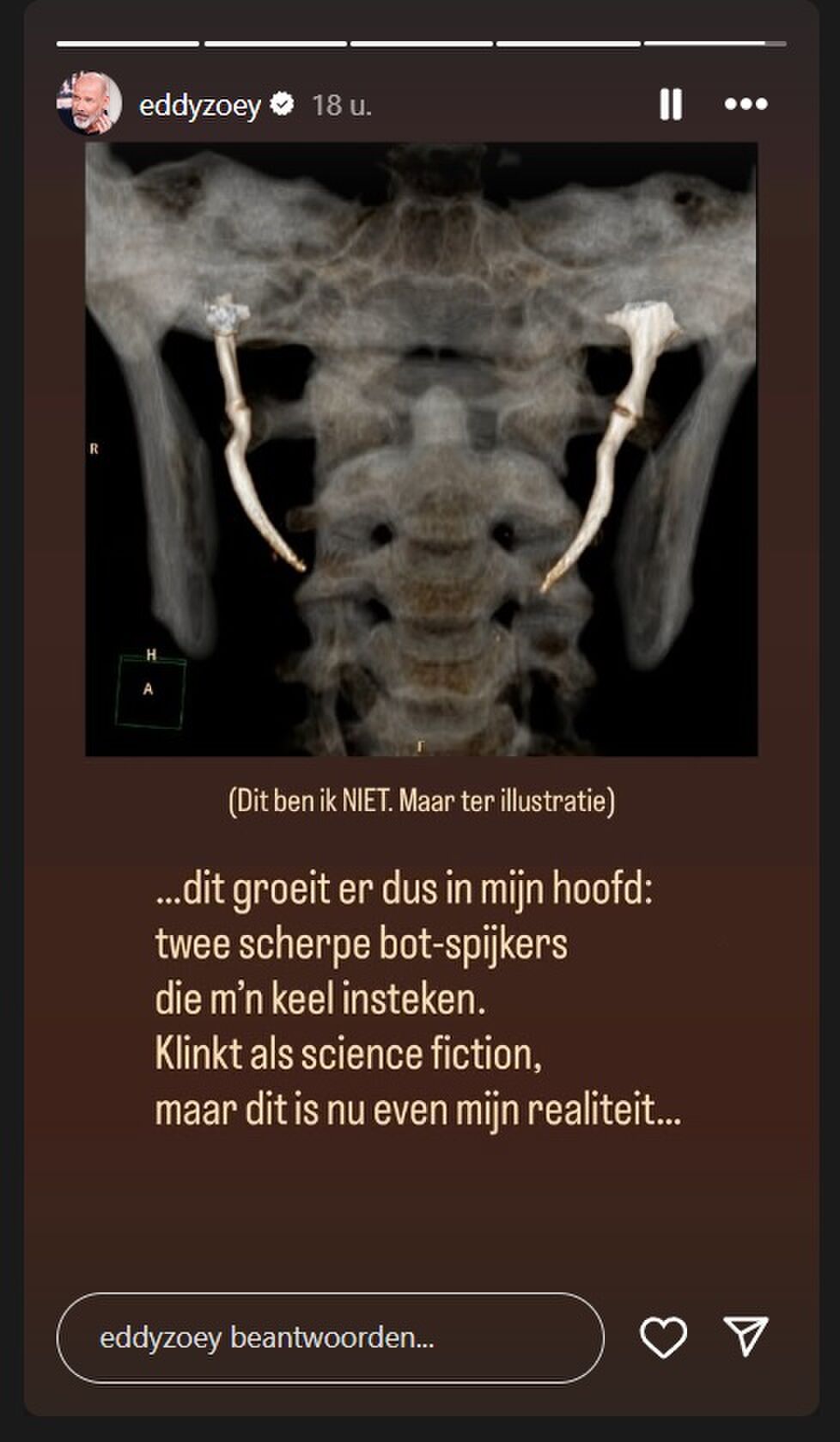 Presentator en muzikant Eddy Zoëy heeft via Instagram laten weten dat hij zijn eerste keeloperatie achter de rug heeft. De ingreep maakt deel uit van een meerdelig traject, omdat zijn zeldzame aandoening, het Eagle-syndroom, niet in 1 keer volledig kan worden opgelost.
