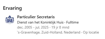 Opmerkelijk is dat op Eveline’s LinkedIn-profiel nog altijd staat dat zij werkzaam is bij het Koninklijk Huis. Dit roept vragen op: is zij wellicht toch weer (deels) actief binnen de organisatie, bekleedt ze een andere rol, of gaat het simpelweg om verouderde informatie?