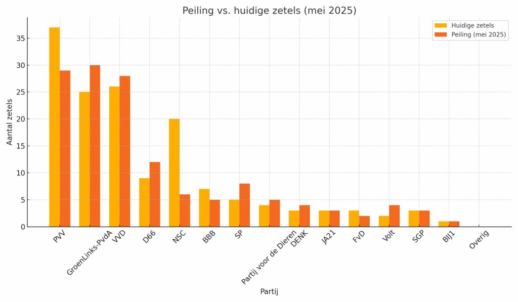Volgens de laatste peilingen (Peilingwijzer, mei 2025) levert de PVV fors in: van 37 naar circa 29 zetels. GroenLinks-PvdA stijgt naar 30, VVD blijft stabiel rond de 28. NSC en BBB zakken verder weg, mogelijk onder de kiesdrempel.
