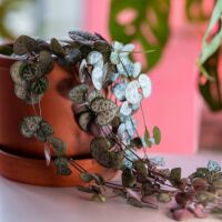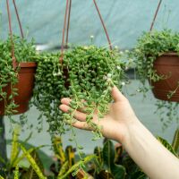 Deze hangplanten hebben bolvormige bladeren, lijken op een kralensnoer.
