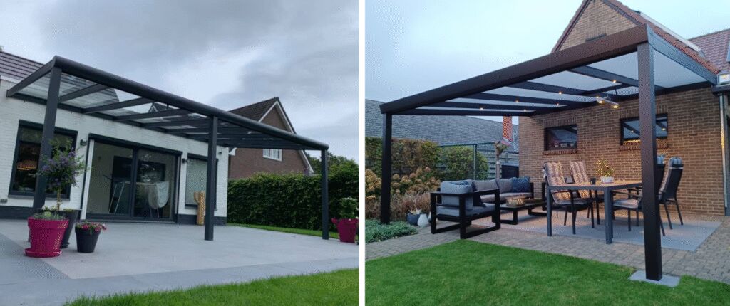 Bedenk eerst hoe je de ruimte wilt gebruiken. Een ontbijtplek voor 2 vraagt om andere afmetingen dan een eethoek voor het hele gezin. Wil je er ook ’s avonds of bij regen kunnen zitten? Dan zijn glazen schuifwanden interessant. Deze keuzes bepalen niet alleen de grootte, maar ook het type dak en de benodigde fundering.