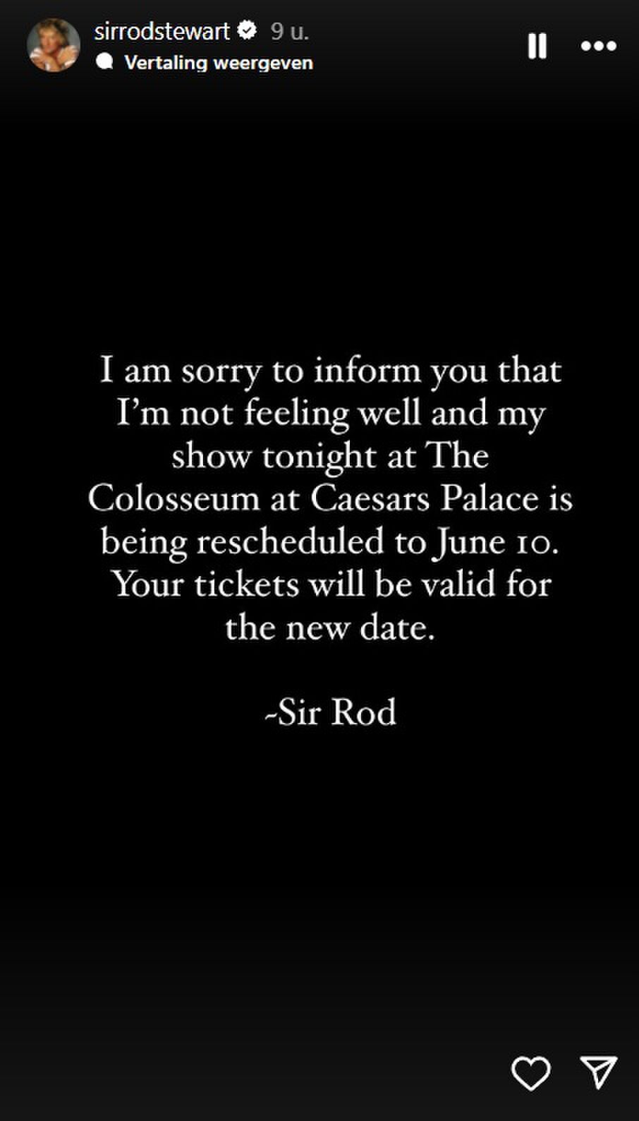 De Britse rocklegende Rod Stewart (80) heeft zijn geplande concert in Las Vegas op het laatste moment moeten afzeggen. Het nieuws komt als een verrassing voor duizenden fans die zich hadden verzameld in The Colosseum van Caesars Palace. Op zijn officiële Instagram-account deelde Stewart dat hij zich ‘niet lekker voelde’ en daardoor niet kon optreden.
