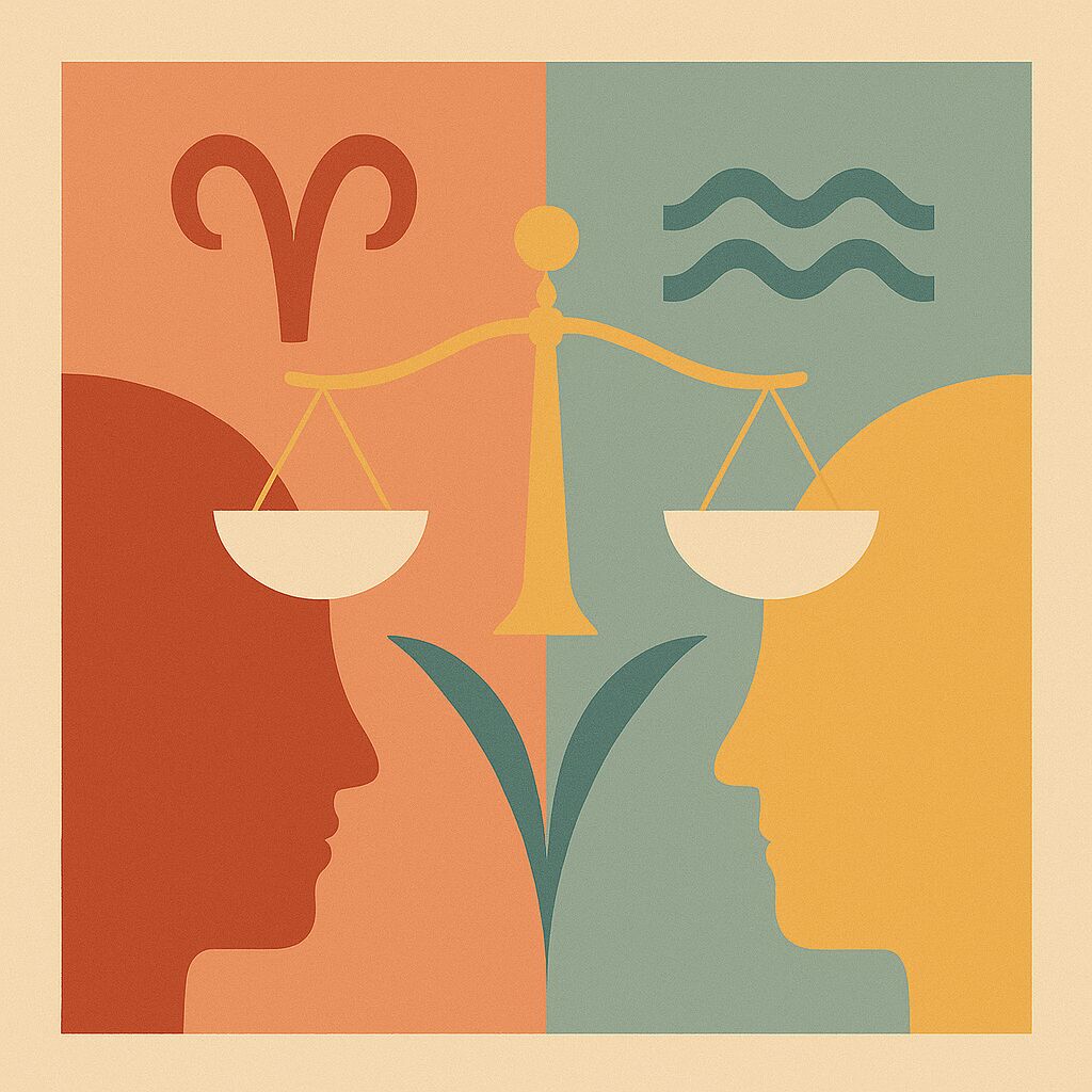 In de astrologie staan tegenover elkaar liggende sterrenbeelden volgens de dierenriem-cyclus 180 graden uit elkaar. Dat maakt dat jullie kernkwaliteiten en behoeftes anders zijn — maar vaak op dezelfde thema’s gericht.