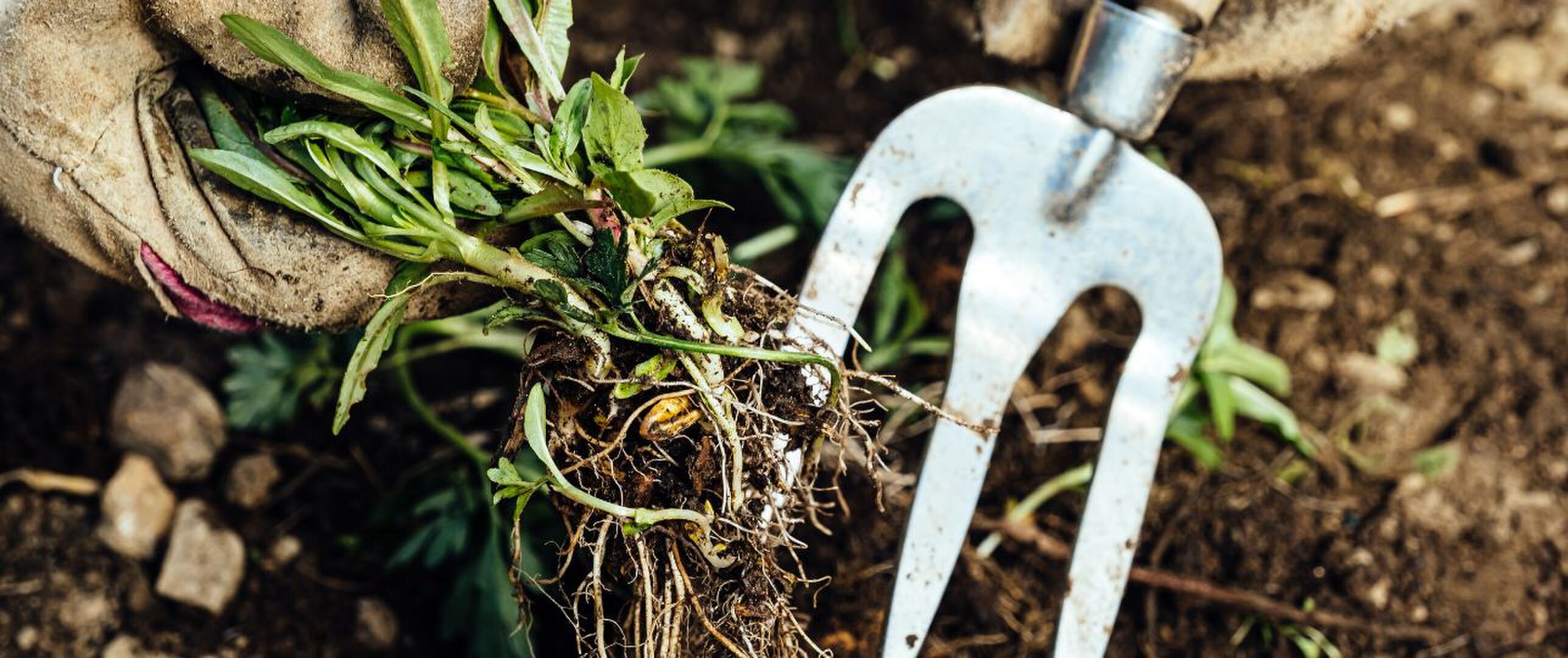 Gebruik een spitvork om de volledige wortels mee te nemen. Zelfs kleine wortelstukjes kunnen opnieuw uitgroeien.