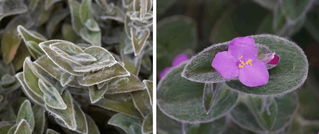 - Tradescantia sillamontana (Fluweelpalm): Paarsgroene bladeren, bedekt met fijne haartjes. Verzorgingstip: Veel licht, regelmatig draaien voorkomt scheefgroei.