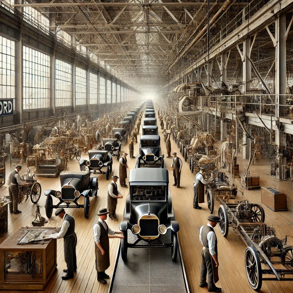 In 1913 bracht de Amerikaanse autofabrikant Ford een revolutie teweeg in de industriële productie door de lopende band te introduceren in zijn fabriek. Dit systeem maakte het mogelijk om auto’s in een fractie van de tijd te assembleren, wat de productie enorm versnelde en de kosten drastisch verlaagde. Door het werk op te splitsen in kleinere, repetitieve taken konden ongeschoolde arbeiders efficiënt bijdragen aan het productieproces. Deze methode maakte de auto bereikbaar voor het grote publiek, waardoor de Ford T de eerste betaalbare auto voor veel Amerikanen werd. De introductie van de lopende band veranderde niet alleen de auto-industrie, maar ook het moderne industriële productieproces wereldwijd.
