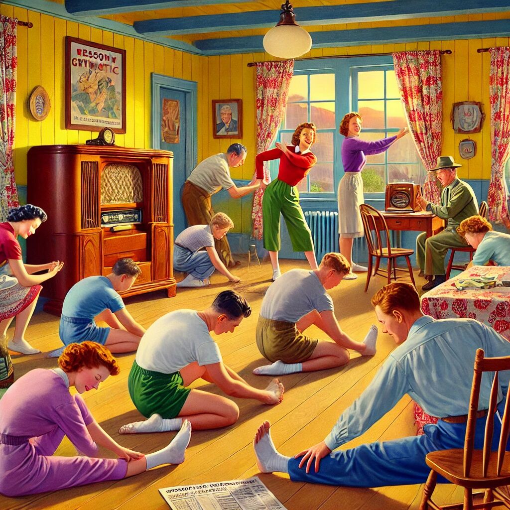 In 1945 begon de Nederlandse radio met het uitzenden van ochtendgymnastiek, een fenomeen dat al snel een dagelijks ritueel werd voor veel luisteraars. Met eenvoudige oefeningen en motiverende muziek werden mensen aangemoedigd om hun dag actief te beginnen, direct vanuit hun huiskamer. De uitzendingen brachten een gevoel van saamhorigheid en bevorderden een gezonde levensstijl in de wederopbouwperiode na de Tweede Wereldoorlog. Voor velen was het een kans om fit te blijven, zelfs zonder sportschool of speciale uitrusting. Deze radio-ochtendgymnastiek werd zo een onderdeel van het Nederlandse ochtendritueel.