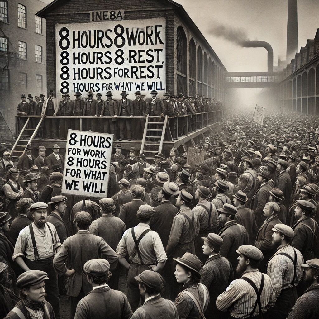 In 1884 begon in de Verenigde Staten een belangrijke arbeidersstaking die uiteindelijk leidde tot de invoering van de achturige werkdag. Werknemers eisten betere arbeidsomstandigheden en kortere werkdagen, aangezien werkdagen van tien tot zestien uur destijds de norm waren. De staking kreeg in 1886 extra kracht tijdens de Haymarket-affaire in Chicago, waar een vreedzaam protest gewelddadig eindigde. Ondanks de confrontaties bleef de roep om arbeidsrechten groeien. Uiteindelijk resulteerden deze inspanningen in de geleidelijke invoering van de achturige werkdag, een belangrijke mijlpaal in de arbeidsstrijd. Deze gebeurtenis legde de basis voor moderne arbeidswetten en de viering van de Dag van de Arbeid.