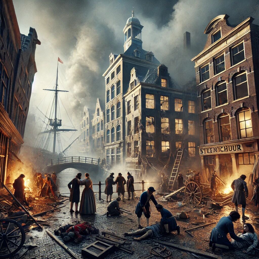 Op 12 januari 1807 werd Leiden opgeschrikt door een verwoestende buskruitramp. Een schip geladen met 17.000 kilo buskruit ontplofte midden in de stad, bij het Steenschuur. De explosie richtte enorme schade aan: tientallen gebouwen werden met de grond gelijkgemaakt, en er vielen ruim 150 doden en honderden gewonden. De ramp liet een diepe indruk achter op de stad en haar inwoners. Koning Lodewijk Napoleon, destijds heerser over Nederland, bezocht persoonlijk de rampplek en bood hulp bij de wederopbouw. Deze gebeurtenis markeerde een van de zwaarste rampen in de Nederlandse geschiedenis.