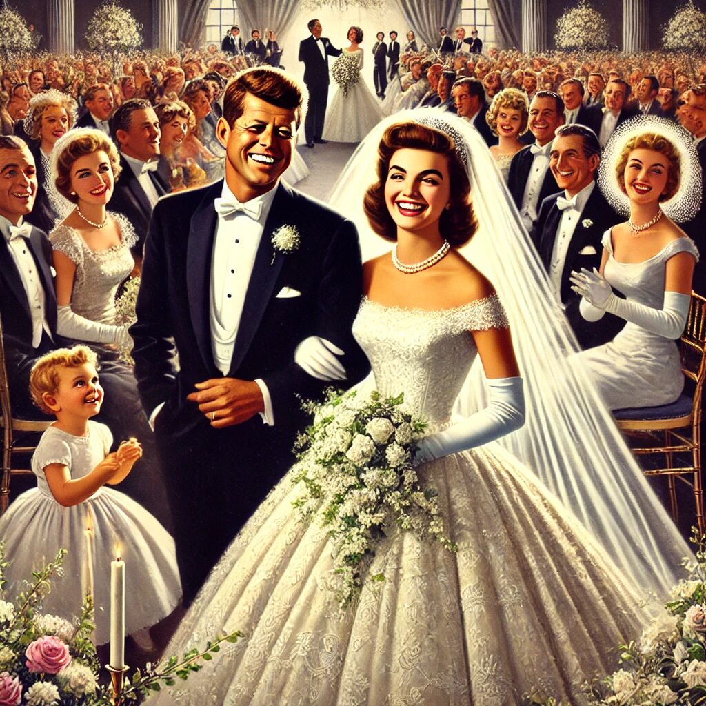 In 1953 trouwde John F. Kennedy met Jacqueline Bouvier in een groots huwelijk in Newport, Rhode Island. Jackie, een gerenommeerde journaliste, werd al snel een stijlicoon en publieke figuur. Kennedy was op dat moment een jonge senator uit Massachusetts, en het huwelijk werd breed uitgemeten in de media. Hun huwelijk zou later een belangrijk onderdeel worden van Kennedy’s politieke carrière en de glamoureuze uitstraling van de Kennedy-familie.
