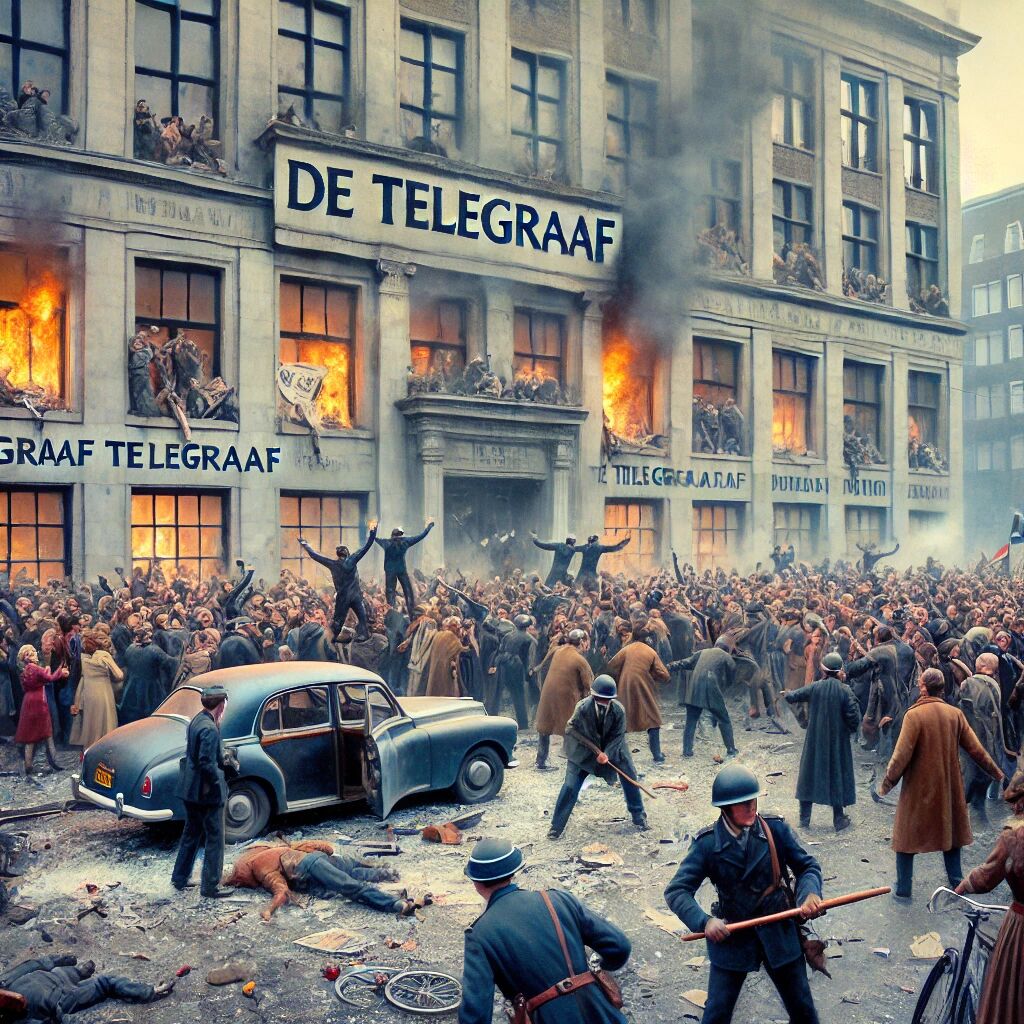 De Telegraafrellen vonden plaats in juni 1966 in Amsterdam, toen boze demonstranten het gebouw van dagblad De Telegraaf bestormden en vernielingen aanrichtten. De rellen ontstonden uit woede over de berichtgeving van de krant over een dodelijk politieoptreden bij een bouwvakkersstaking. De protesterende menigte bestond voornamelijk uit arbeiders en jongeren die vonden dat de krant de harde politieactie vergoelijkte. Tijdens de ongeregeldheden werden ruiten ingegooid en auto’s in brand gestoken, terwijl de politie hard ingreep met traangas en wapenstokken. De rellen markeerden een periode van groeiende maatschappelijke onrust in Nederland, waarbij het wantrouwen tegenover autoriteiten steeds groter werd.