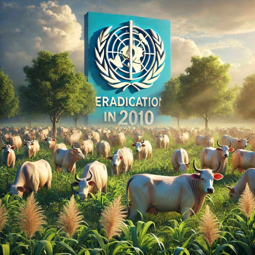 In 2010 verklaarde de Voedsel- en Landbouworganisatie van de Verenigde Naties dat de runderpest, een dodelijke virusziekte onder vee, wereldwijd was uitgeroeid. Dit was een historische mijlpaal, omdat runderpest eeuwenlang grote schade had aangericht in de veeteelt, met hongersnood en economische verliezen tot gevolg. Het succes van de uitroeiing was te danken aan decennia van intensieve vaccinatiecampagnes en internationale samenwerking. Runderpest is na de pokken het tweede virus dat door menselijke inspanningen volledig is uitgeroeid. Deze prestatie wordt gezien als een belangrijke stap in het waarborgen van de voedselzekerheid wereldwijd.
