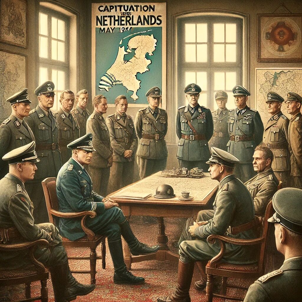 Op 15 mei 1940 capituleerde Nederland na vijf dagen van hevige strijd tegen het Duitse leger. De capitulatie volgde op het verwoestende bombardement van Rotterdam op 14 mei, waarbij een groot deel van de stad in vlammen opging en honderden burgers omkwamen. Om verdere vernietiging te voorkomen, besloot de Nederlandse legerleiding zich over te geven. Hiermee begon een periode van bezetting die tot 1945 zou duren. De capitulatie markeerde een ingrijpende wending in de geschiedenis van Nederland, met gevolgen die nog jarenlang voelbaar zouden blijven.