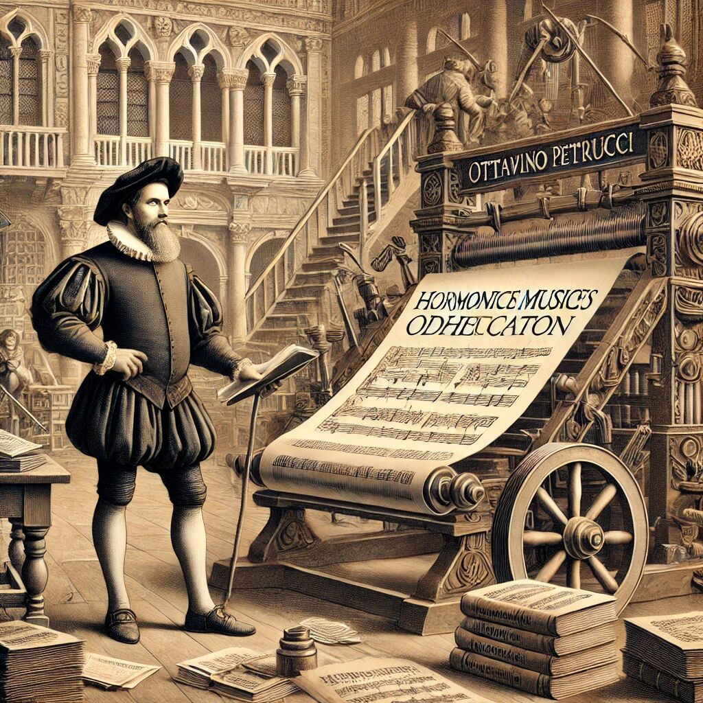 In 1501 publiceerde Ottaviano Petrucci in Venetië het eerste gedrukt muziekboek, genaamd Harmonice Musices Odhecaton. Dit baanbrekende werk maakte gebruik van een nieuwe druktechniek waarbij muzieknoten en lijnen apart werden gedrukt, wat zorgde voor een hoge precisie en kwaliteit. Petrucci’s methode revolutioneerde de verspreiding van muziek in Europa en maakte het toegankelijker voor musici en liefhebbers. Zijn drukwerk speelde een cruciale rol in de verspreiding van renaissancemuziek en wordt beschouwd als een mijlpaal in de muziekgeschiedenis. Petrucci wordt daarom vaak de “vader van de muziekdrukkunst” genoemd.