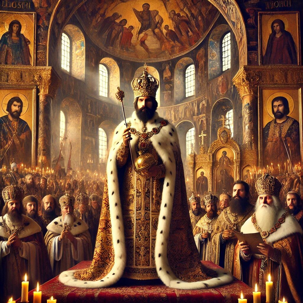 Op 16 januari 1547 werd Ivan IV, beter bekend als Ivan de Verschrikkelijke, gekroond tot de eerste tsaar van Rusland. De ceremonie vond plaats in de Kathedraal van de Dormitie in het Kremlin van Moskou. Door zichzelf tot tsaar te laten kronen in plaats van grootvorst, maakte Ivan duidelijk dat hij een absolute heerser wilde zijn, met goddelijke autoriteit boven de adel en de kerk. Zijn kroning markeerde het begin van het Russische tsarenrijk en werd gekenmerkt door pracht en symboliek. Ivan’s regeerperiode bracht zowel modernisering als wreedheid met zich mee, waaronder de oprichting van de oprichnina, een gewelddadige staatscampagne om de macht van de adel te onderdrukken. De kroning blijft een belangrijk moment in de Russische geschiedenis.