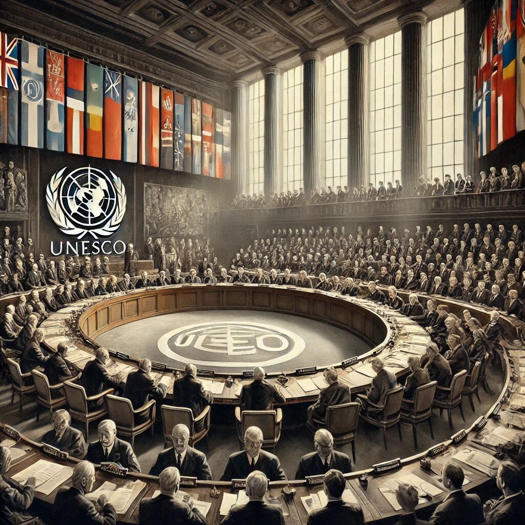 In 1945 is de UNESCO (Organisatie van de Verenigde Naties voor Onderwijs, Wetenschap en Cultuur) opgericht in Londen. Op 16 november 1945 kwamen vertegenwoordigers van 44 landen bijeen om een organisatie op te richten die wereldwijd zou werken aan het bevorderen van vrede en veiligheid door middel van samenwerking op het gebied van onderwijs, wetenschap, cultuur en communicatie. De oprichting van UNESCO was een reactie op de verwoestingen van de Tweede Wereldoorlog, met als doel toekomstige oorlogen te voorkomen door culturele en intellectuele samenwerking tussen naties te bevorderen.