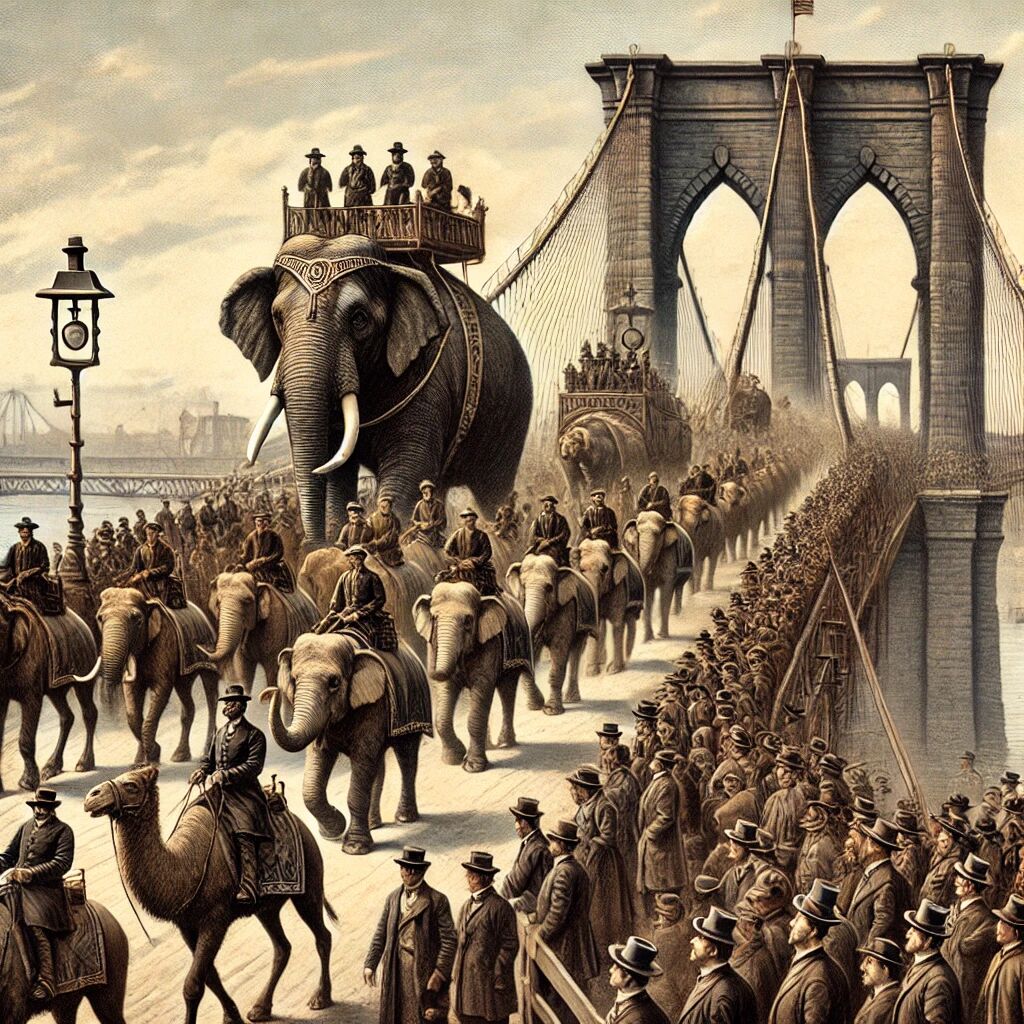 1884 – In New York marcheren 21 olifanten en 17 kamelen over de Brooklyn Bridge
