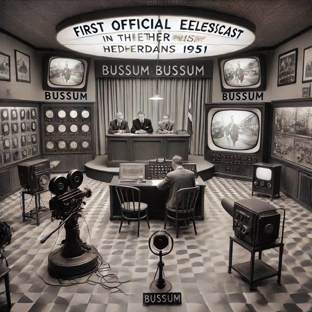 In 1951 vond de eerste officiële televisie-uitzending in Nederland plaats, een historisch moment dat het begin markeerde van het televisietijdperk in het land. De Nederlandse Televisie Stichting (NTS) verzorgde deze uitzending, die werd uitgezonden vanuit een kleine studio in Bussum. Hoewel slechts een handjevol huishoudens een televisietoestel had, groeide de belangstelling snel. De uitzendingen begonnen bescheiden, met enkele uren per week, maar televisie zou al snel een vast onderdeel van het Nederlandse dagelijks leven worden. Dit markeerde een nieuw tijdperk in de Nederlandse media en communicatie.