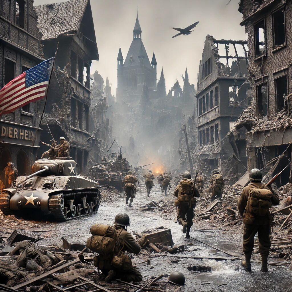 In oktober 1944 viel Aken, de eerste grote Duitse stad, in handen van de geallieerden tijdens de Tweede Wereldoorlog. Na weken van hevige gevechten en bombardementen werd de stad ingenomen door Amerikaanse troepen, waarmee een belangrijke doorbraak werd bereikt in de strijd tegen nazi-Duitsland. De slag om Aken markeerde het begin van de geallieerde opmars naar het hart van Duitsland, terwijl de Duitse verdediging steeds verder afbrokkelde. De verovering van de stad was symbolisch en strategisch belangrijk, omdat het de eerste keer was dat geallieerde troepen Duitse grondgebied binnendrongen. Dit zorgde voor een psychologische klap voor het Duitse moreel en versterkte de hoop op een spoedige overwinning.