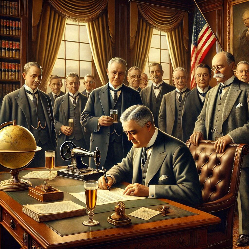 In 1933 maakte president Franklin D. Roosevelt een einde aan de drooglegging in de Verenigde Staten door het ondertekenen van de 21e amendement. Deze maatregel beëindigde het verbod op de productie, verkoop en consumptie van alcohol, dat sinds 1920 van kracht was geweest onder het 18e amendement. De drooglegging was bedoeld om maatschappelijke problemen zoals alcoholisme en criminaliteit te verminderen, maar leidde juist tot illegale handel en de opkomst van georganiseerde misdaad. Met de legalisering van alcohol werden ook nieuwe banen en belastinginkomsten gecreëerd, wat van groot belang was tijdens de Grote Depressie. Roosevelt zou bij de ondertekening hebben gezegd: “I think this would be a good time for a beer.”