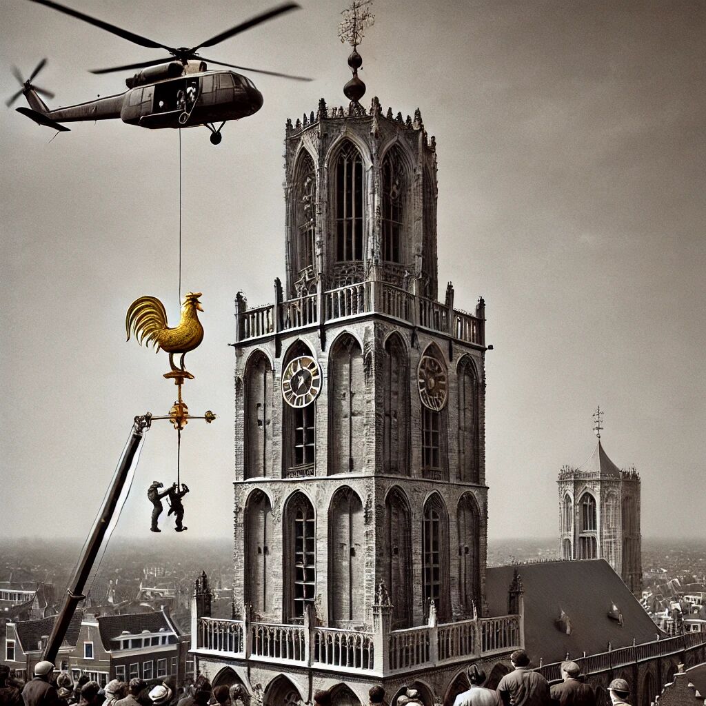 In 1995 vond een opmerkelijke operatie plaats in Utrecht: een helikopter verwijderde de iconische windwijzer van de Domtoren. Dit gebeurde als onderdeel van een grote restauratie van de toren, die te kampen had met slijtage en beschadigingen door weer en wind. De gouden haan, die sinds de 19e eeuw bovenop de toren stond, werd voorzichtig losgemaakt en met uiterste precisie naar beneden gevlogen. Duizenden toeschouwers keken ademloos toe hoe de eeuwenoude windwijzer werd neergelaten. Deze spectaculaire actie markeerde een belangrijk moment in het behoud van dit historische monument. Na grondige restauratie zou de haan later weer zijn vertrouwde plek op de hoogste kerktoren van Nederland innemen.