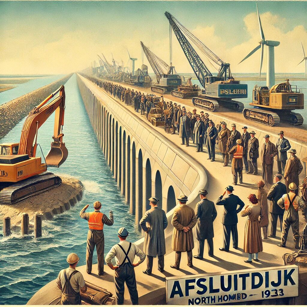 In 1933 werd de Afsluitdijk voltooid, een mijlpaal in de Nederlandse waterbouwkunde. Deze imposante dijk, die de Zuiderzee afsluit van de Waddenzee, verbindt Noord-Holland met Friesland en strekt zich uit over een lengte van 32 kilometer. Het project, ontworpen door ingenieur Cornelis Lely, maakte van de Zuiderzee een binnenmeer, dat we nu het IJsselmeer noemen. De Afsluitdijk beschermt Nederland tegen overstromingen en biedt tegelijkertijd nieuwe mogelijkheden voor landaanwinning en zoetwatervoorziening. Het is een symbool van Nederlandse innovatie en strijd tegen het water, en blijft tot op de dag van vandaag een iconisch bouwwerk.