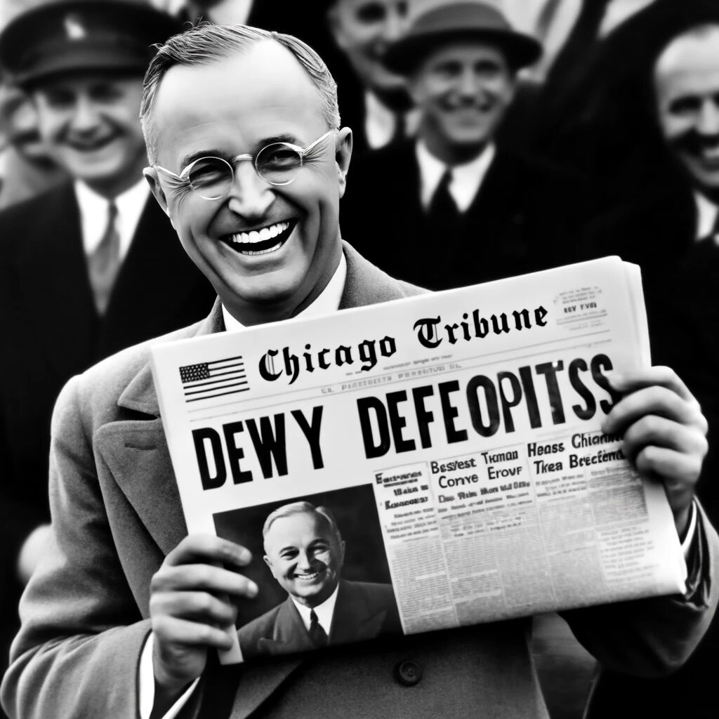 In 1948 maakte de krant Chicago Tribune een beruchte fout door de kop “Dewey defeats Truman” te publiceren, terwijl Harry Truman uiteindelijk de Amerikaanse presidentsverkiezingen had gewonnen. De fout kwam voort uit overhaaste berichtgeving en de aanname dat Truman geen kans maakte. Truman’s overwinning werd pas later die nacht duidelijk, en de krant was al in druk met de verkeerde kop. Een iconisch moment volgde toen Truman triomfantelijk met de krant poseerde, lachend om de vergissing. Dit incident wordt nog steeds aangehaald als een waarschuwing tegen voorbarige conclusies in de media.