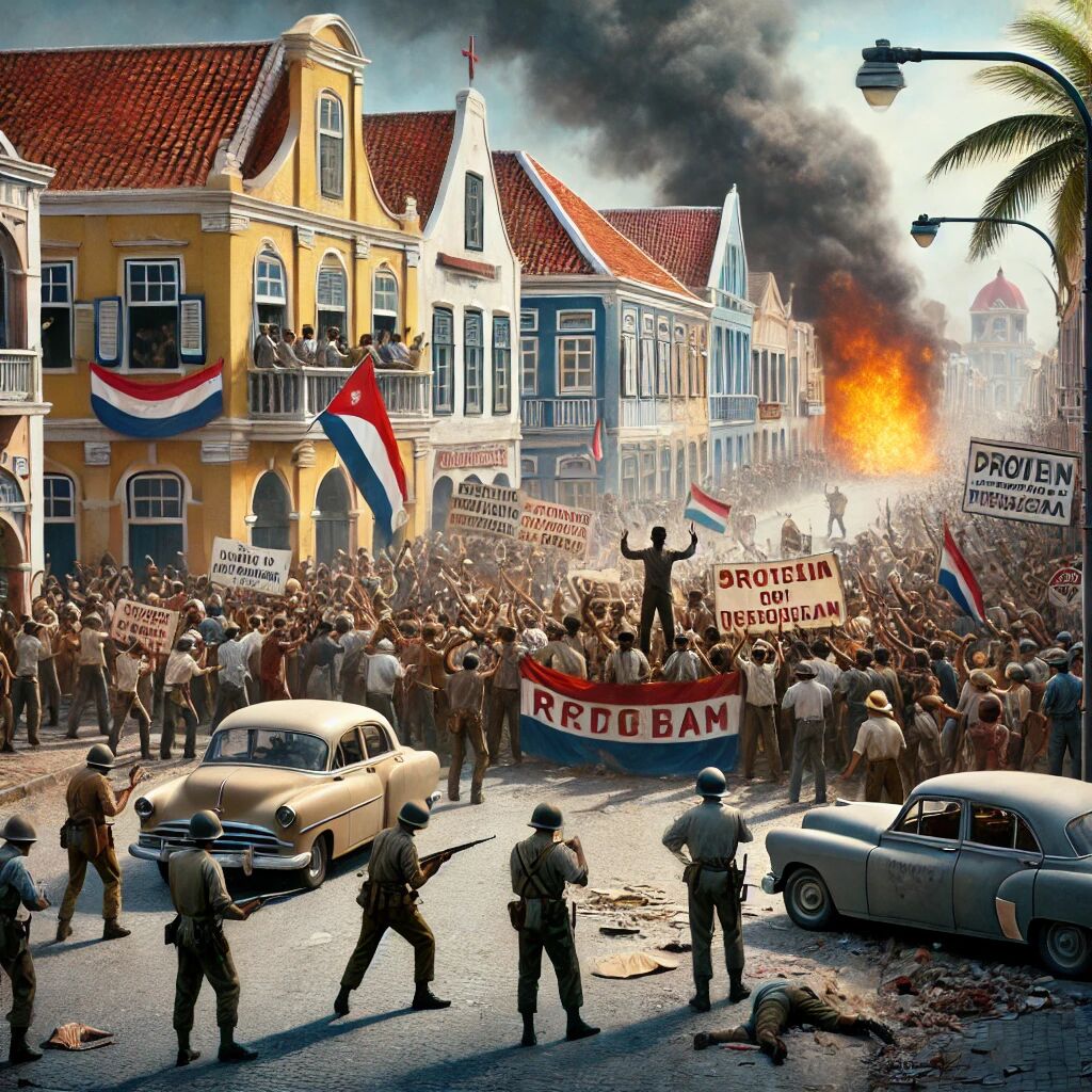 In 1969 vond er een grote arbeidersopstand plaats in Willemstad, Curaçao, die bekend werd als de Mei-revolte. Op 30 mei kwamen arbeiders in opstand tegen de lage lonen en slechte arbeidsomstandigheden in de olieraffinaderijen, met name bij Shell, een van de grootste werkgevers op het eiland. De demonstraties begonnen vreedzaam, maar escaleerden al snel in gewelddadige rellen waarbij delen van de binnenstad in brand werden gestoken. De opstand leidde tot een harde reactie van de politie en het inzetten van Nederlandse mariniers om de orde te herstellen. Dit historische moment markeerde een belangrijke verschuiving in de sociaaleconomische en politieke verhoudingen op Curaçao, met meer aandacht voor arbeidersrechten en zelfbestuur binnen het Koninkrijk der Nederlanden. Het blijft een mijlpaal in de geschiedenis van het eiland.