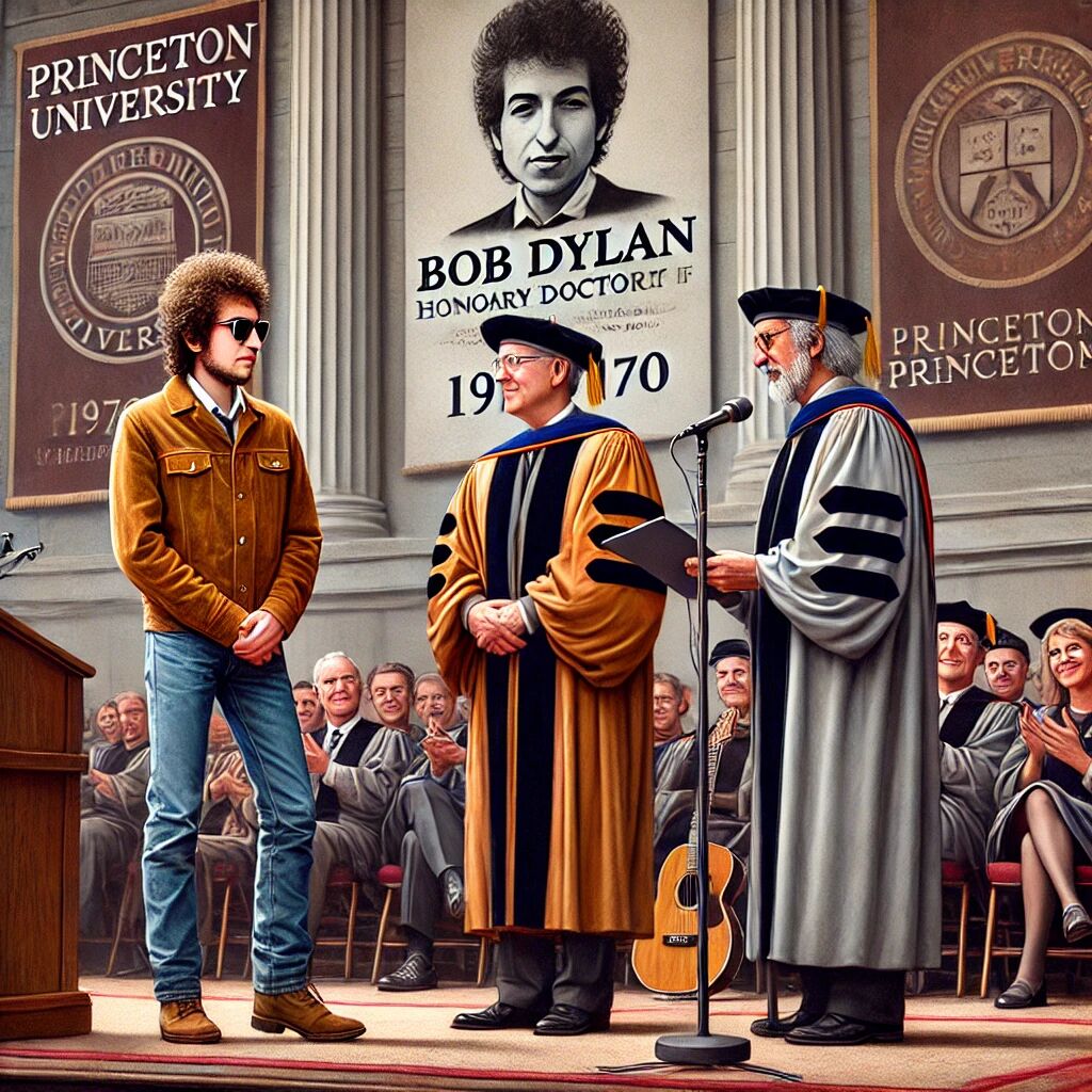 Op 9 juni 1970 ontving Bob Dylan een eredoctoraat in de Muziek van de Princeton University. De prestigieuze universiteit erkende hiermee zijn invloed op de moderne muziek en poëzie. Op dat moment was Dylan al een icoon van de folk- en rockmuziek, bekend om zijn diepgaande songteksten en vernieuwende stijl. Tijdens de ceremonie verscheen hij in een opvallend bruin suède jasje en zonnebril, wat zijn rebelse imago versterkte. Hoewel sommige academici twijfelden aan de erkenning van een jonge muzikant, werd Dylan later wereldwijd geprezen als een van de grootste tekstschrijvers aller tijden. In 2016 ontving hij zelfs de Nobelprijs voor Literatuur voor zijn songteksten. Zijn nummers, zoals “Blowin’ in the Wind” en “Like a Rolling Stone”, werden hymnes voor sociale verandering en persoonlijke introspectie.